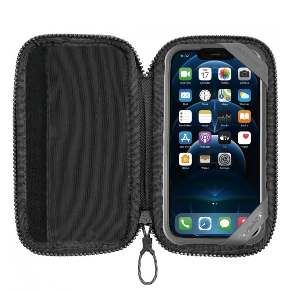 Custodia robusta e protettiva con rivestimento in morbido velluto per proteggere gli oggetti di valore. Dispone di due tasche interne per una migliore organizzazione, una delle quali in rete con cerniera per tenere a posto smartphone, carte bancarie, banconote, monete e chiavi. La cerniera a tutto tondo offre un accesso ottimale al contenuto. Le cinghie elastiche in silicone tengono saldamente lo smartphone quando la custodia è aperta. Può essere riposto nella tasca della maglia.