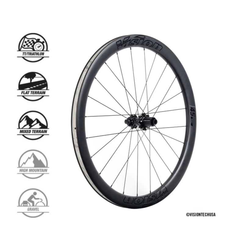 Le nuove Vision SC 45 per copertoncino o tubeless ready in carbonio con profilo da 45 mm, sono un upgrade importante per migliorare la vostra bici offrendo un elevata performance ad alte velocità, ma permettendo anche l’utilizzo in salita grazie ad un peso contenuto a 1590 gr a coppia