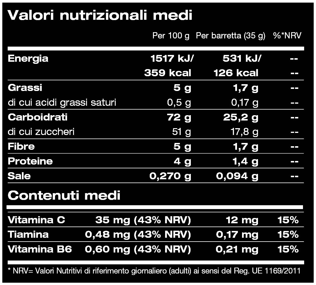 Si consiglia l’assunzione di 1 – 2 barrette, prima o durante l’allenamento o la gara.